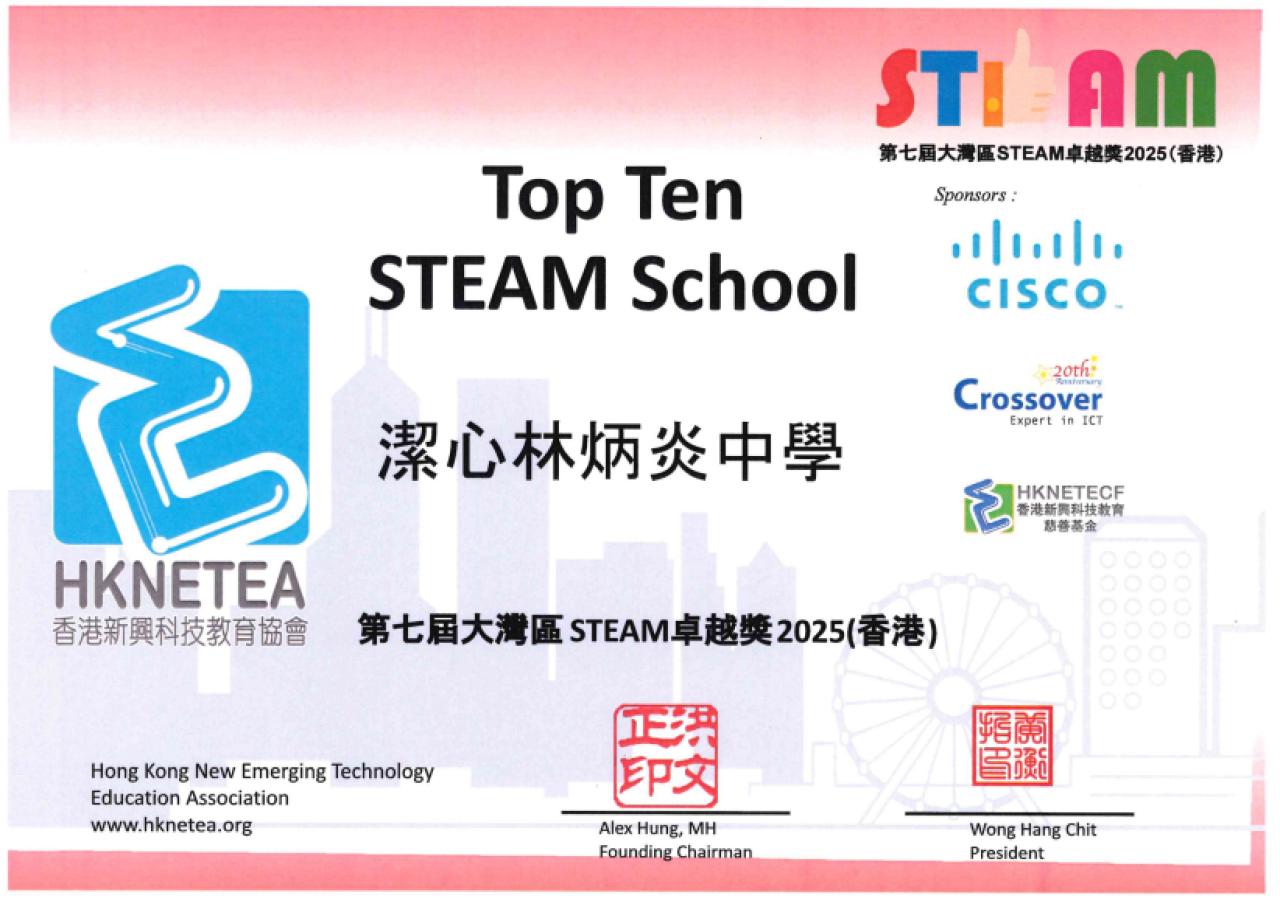 By admin, 8 一月, 2026 2025-09-18 本校榮獲2025年第七屆大灣區STEAM卓越獎(香港)十佳STEAM學校,獎項表揚學校和教師對STEAM教育的奉獻和承諾,肯定本校在培養學生跨學科學習、創造、創新和解難的能力,亦彰顯潔心同學在STEAM(科學、技術、工程、藝術和數學)的出色表現。 學術活動