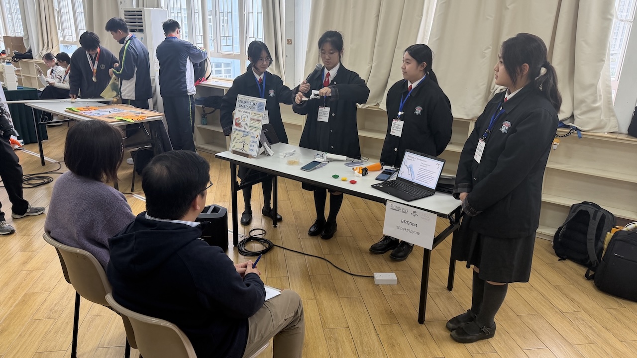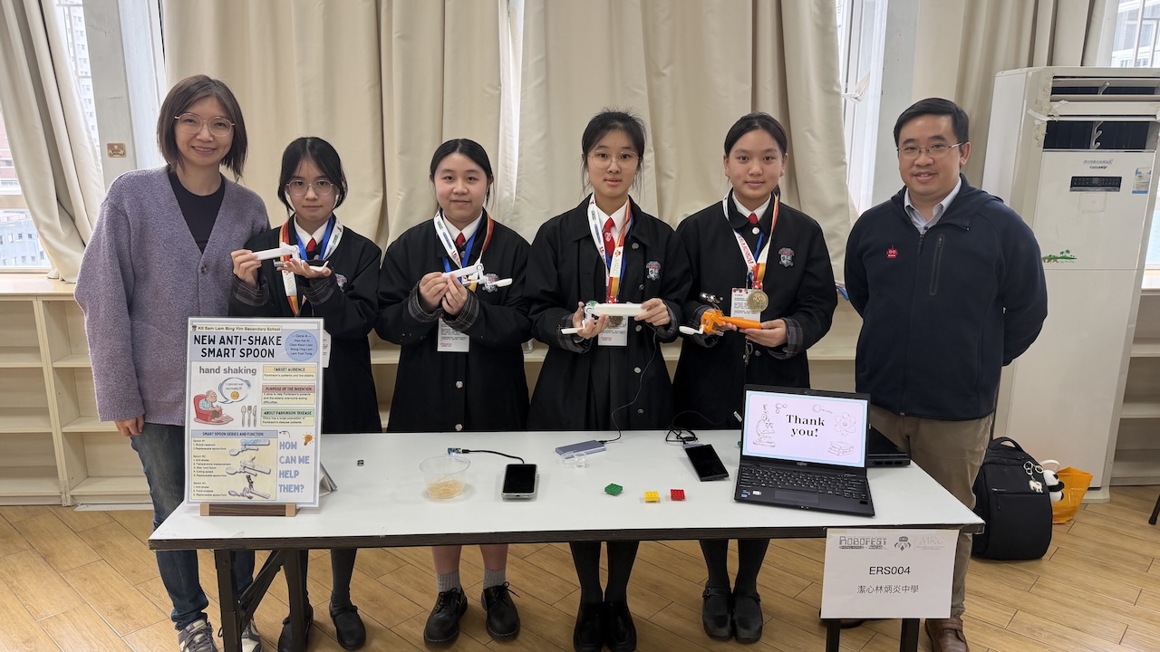 在展覽賽中,中三級學生(3A陳君琳、林悅潼、毛佳琪、黃映琳)針對帕金遜患者與長者研發「新型智能防抖匙羹」。團隊設計了三款具備不同智能功能的匙羹,協助患者穩定進食。憑藉關懷弱勢的創新意念與精彩匯報,成功摘下冠軍寶座。