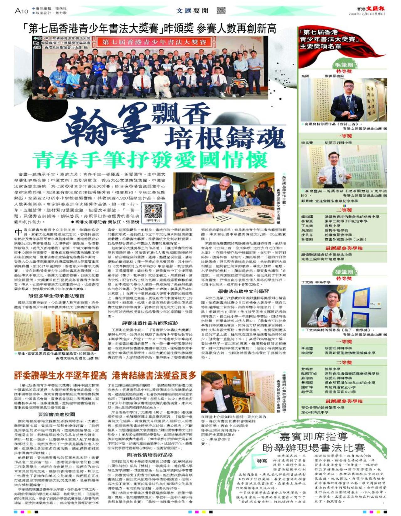 「第七屆香港青少年書法大獎賽」昨頒獎參賽人數再創新高 青春手筆抒發愛國情懷