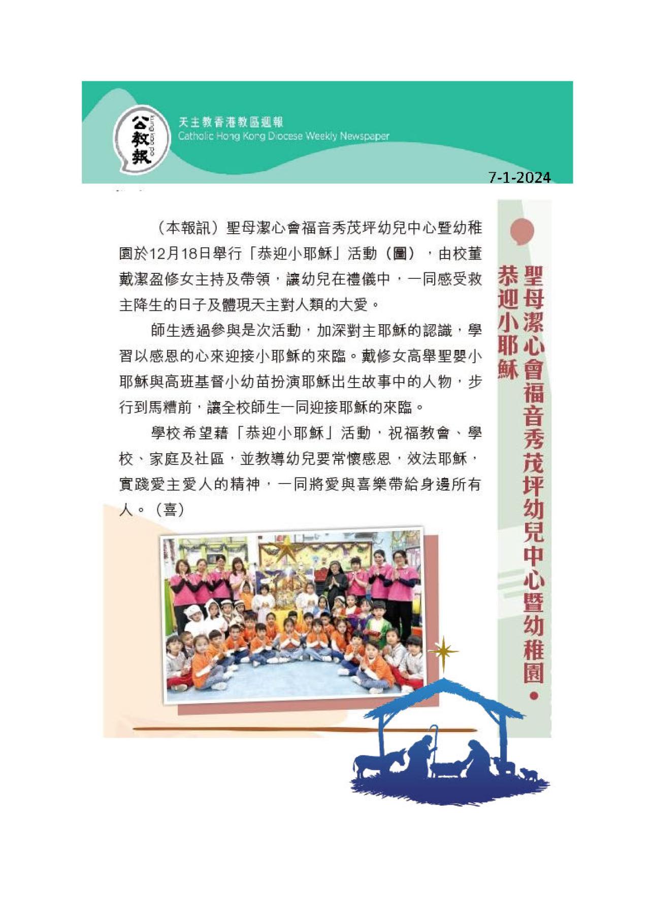 聖母潔心會福音秀茂坪幼兒中心暨幼稚園 恭迎小耶穌